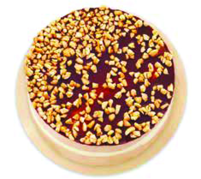 White and dark chocolate mousse layered with crunchy chocolate biscuits, glazed with gianduja cream and covered with a crispyrice topping.