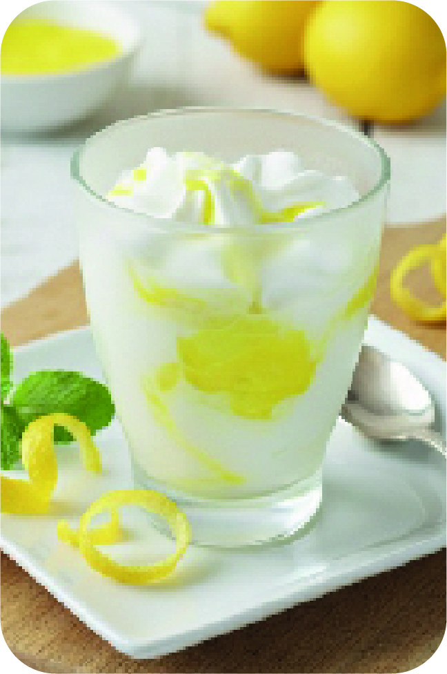 A refreshing, high-quality lemon ice cream rippled with limoncello. Served in a glass.